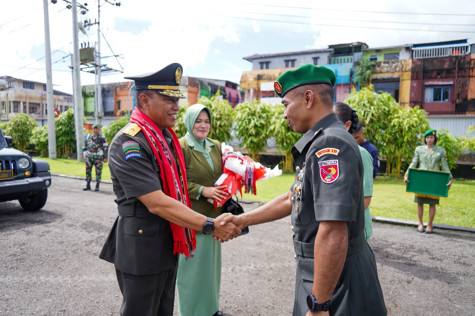 Tiba di Jalan depan Makodam XVI/Pattimura, Kasdam yang didampingi istri Ny. Aminah Agung Pambudi, menerima pengalungan kain tenun khas Maluku dan bunga tangan oleh Aspers Kasdam XVI/Pattimura, selanjutnya berjalan menuju Makodam disambut oleh para pejabat utama Kodam XVI/Pattimura dan seluruh prajurit Kodam.