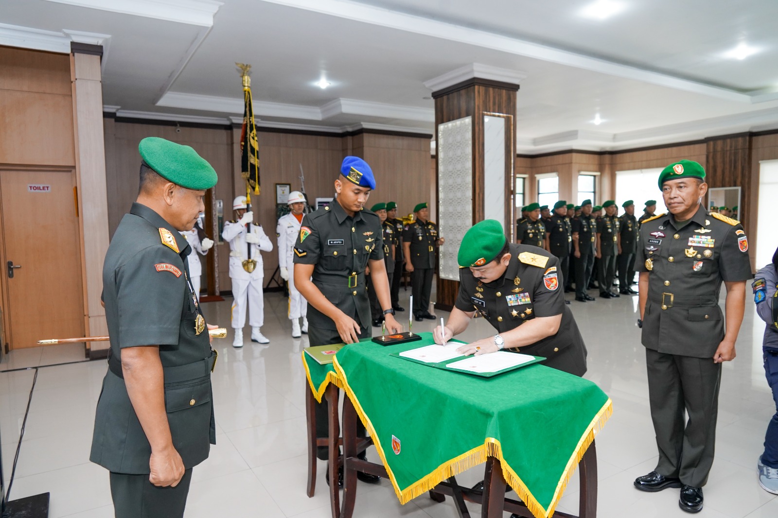 Setelah itu dilanjutkan dengan pelaksanaan Sertijab yang di pimpin oleh Pangdam di ruang Lobby Makodam. Bersamaan dengan Sertijab Kasdam, juga dilakukan Sertijab Wakil Ketua Persit KCK Daerah XVI/Pattimura dari Ny. Evi Asep Abdurachman kepada Ny. Aminah Agung Pambudi.
